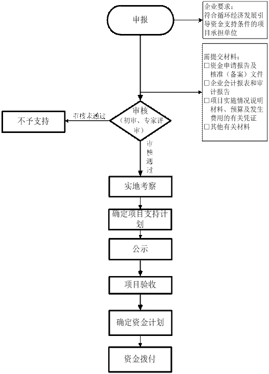 需提交的材料 | 1、循环经济发展引导资金申请报告,并附投资项目核准(备案)文件(原件、一式两份、拟留件),其中项目核准或备案文件原件退还,留存复印件); 2、经会计师事务所审计的上年度企业会计报表和审计报告(复印件、一式两份、拟留件); 3、项目实施情况说明材料、预算及发生费用的有关凭证(复印件、一式两份、拟留件); 4、其他有关材料(复印件、一式两份、拟留件)。 |