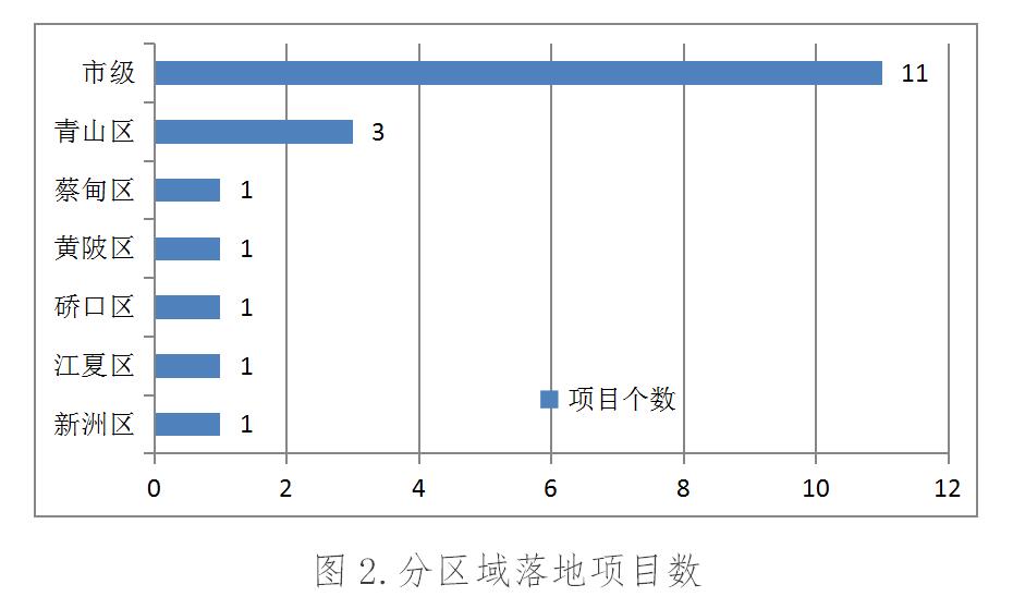 根据分区域项目落地情况,2017年1-12月,累计新落地项目数排名:市级11个;青山区3个;新洲区1个;江夏区1个;硚口区1个;黄陂区1个;蔡甸区1个。